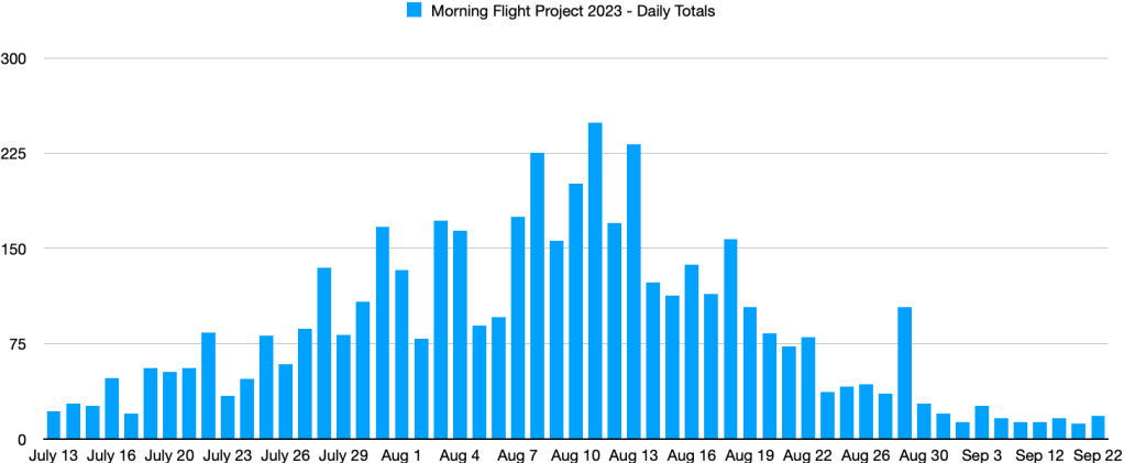 I was able to conduct my observations on 55 days between July 13 – September 22, 2023 with a total of 132 hours up from 112.25 hours in 2022. Average temperature was 73F with a high daytime temperature at 79F and lowest at 63F. Average wind speed was 4 mph with a max wind of 10 mph. Wind direction was predominately SSW (18 days).