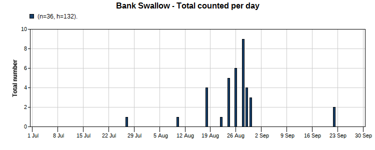 Bank Swallow (10/55) Total Number 36 Max [9 8/28] Date Span (7/27-9/22)