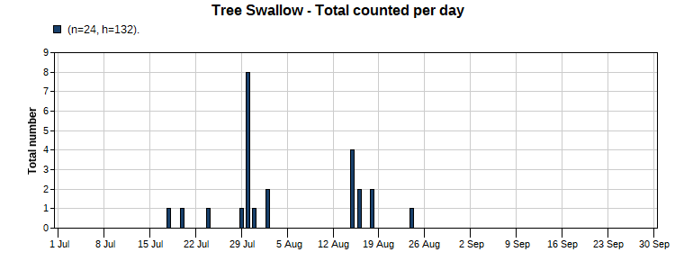 Tree Swallow (11/55) Total Number 24 Max [8 7/30] Date Span (7/18-8/24)
