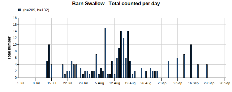 Barn Swallow (47/55) Total Number 209 Max [15 8/8) Date Span (7/13-9/22)