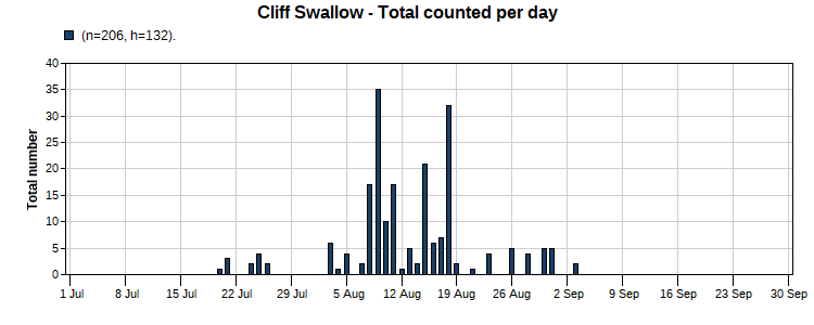 Cliff Swallow (28/55) Total Number 206 Max [35 8/9] Date Span 7/20-9/3)