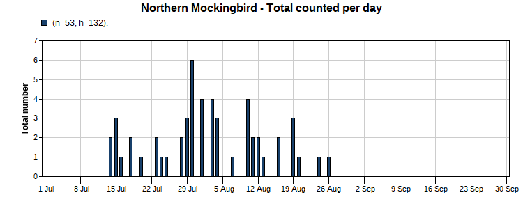 Northern Mockingbird (24/55) Total Number 53 Max [6 7/30] Date Span (7/14-8/26)