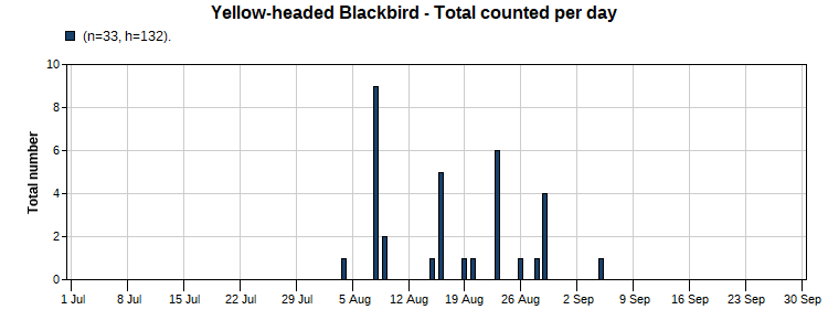 Yellow-headed Blackbird (12/55) Total Number 33 Max [9 8/8] Date Span (8/4-9/5)