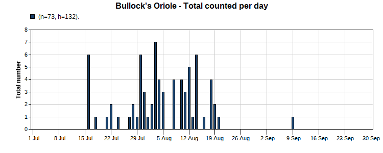 Bullock’s Oriole (26/55) Total Number 73 Max [7 8/3] Date Span (7/16-9/9)