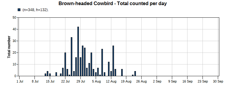 Brown-headed Cowbird (32/55) Total Number 348 Max [42 7/28] Date Span (7/13-8/23)