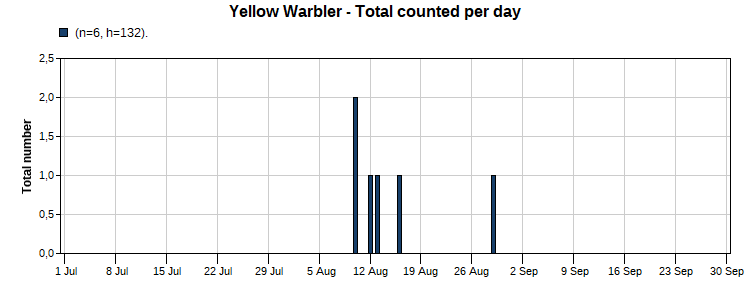 Yellow Warbler (5/55) Total Number 6 Max [2 8/10] Date Span (8/10-8/29)