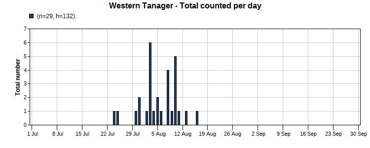 Western Tanager (15/55) Total Number 29 Max [6 8/3] Date Span (7/24-8/16)