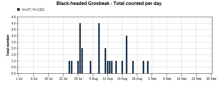 Black-headed Grosbeak (17/55) Total Number 27 Max [4 7/30] Date Span (7/25-8/31)